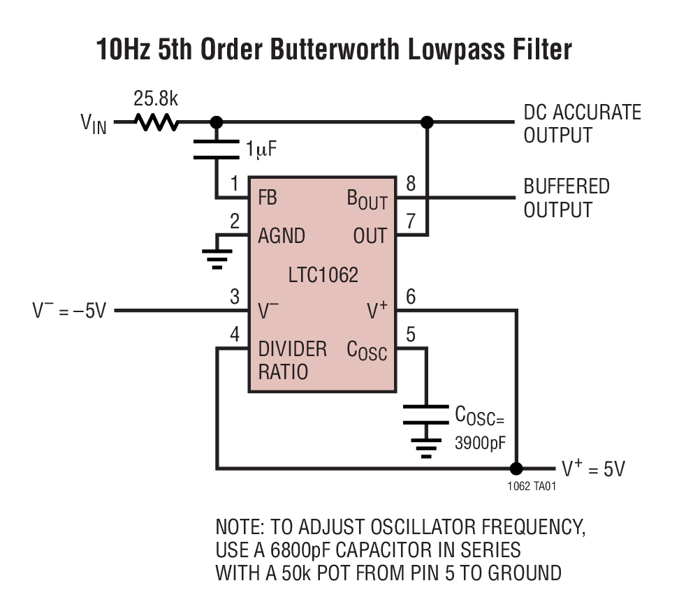 The LTC?1062 is a 5th order all pole maximally flat lowpass filter with no DC error. Its unusual architecture puts the filter outside the DC path so DC offset and low frequency noise problems are eliminated. This makes the LTC1062 very useful for lowpass filters where DC accuracy is important.